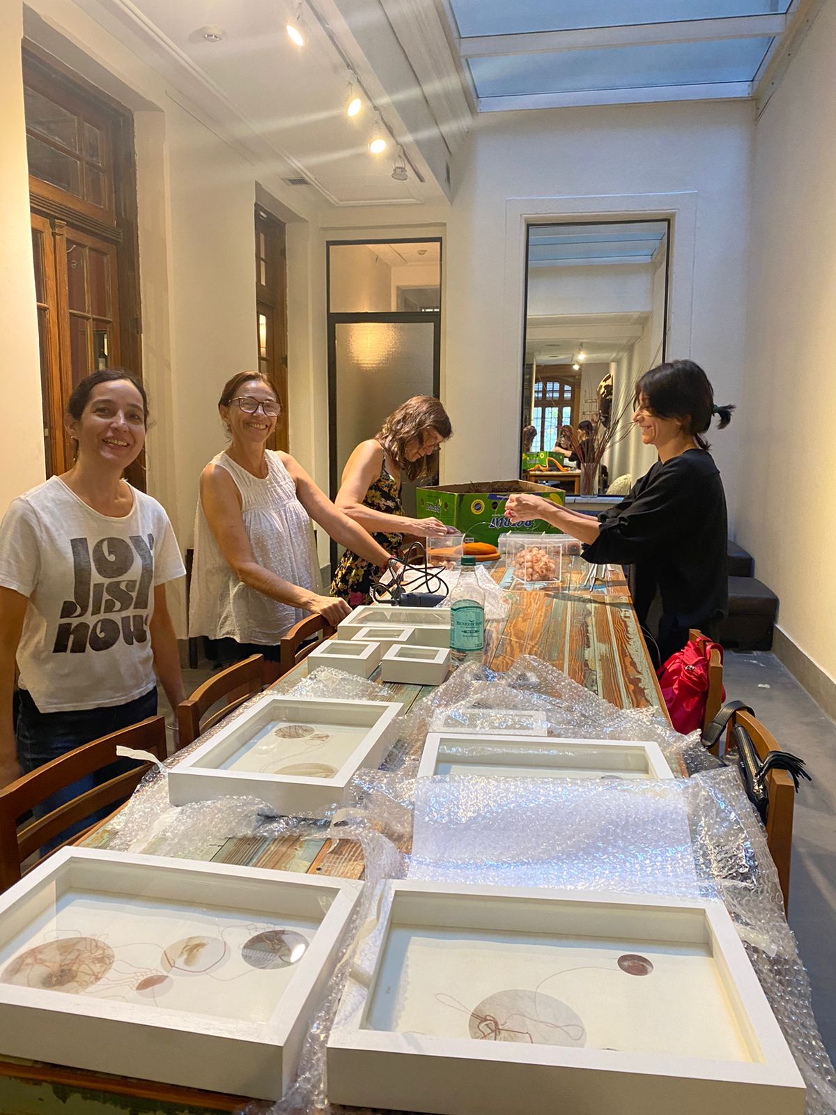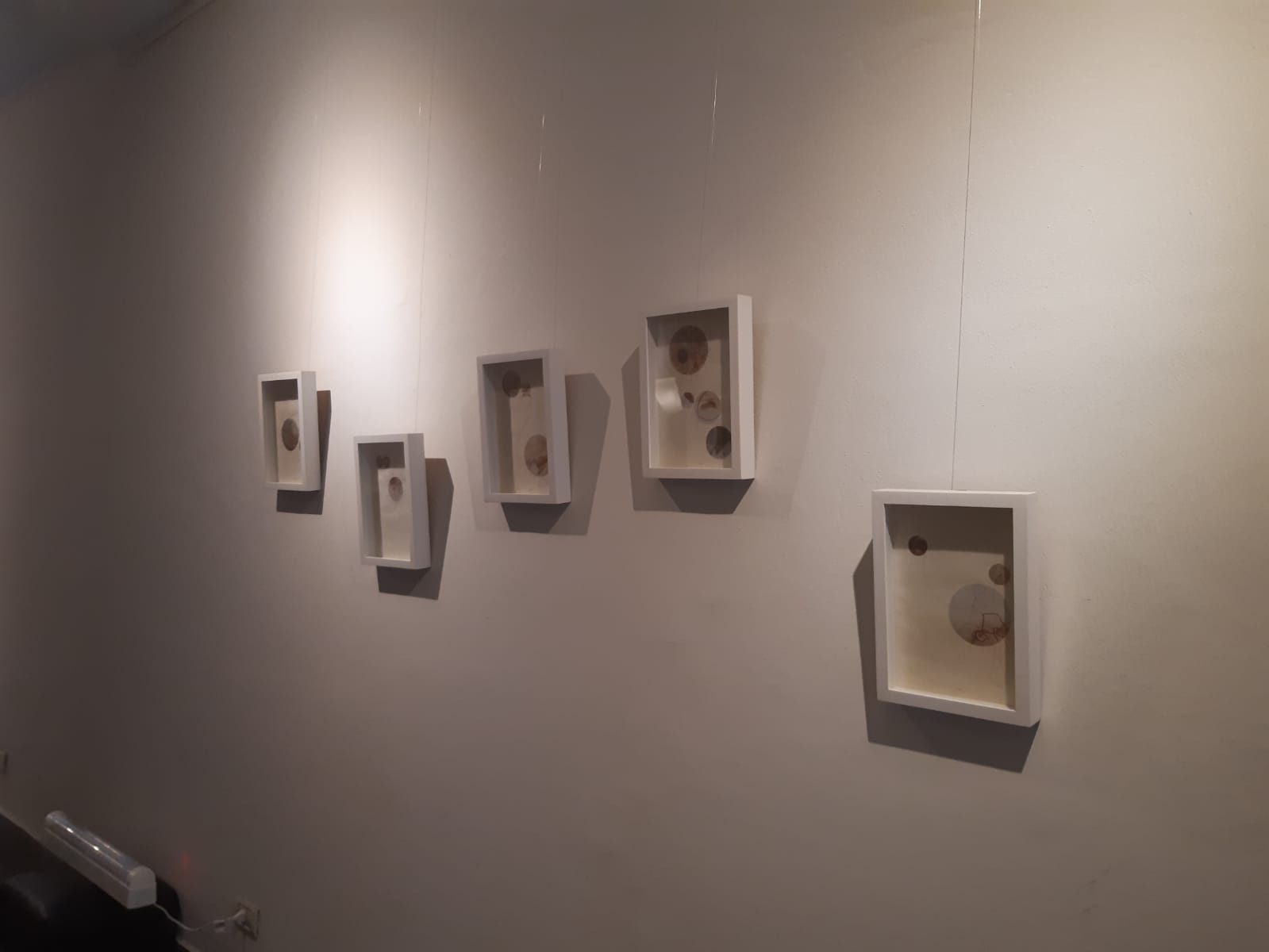 Previo al bordado, se imprimen sobre el papel diferentes fotografías circulares de objetos textiles (de mi autoría), de tamaños variables. Sobre la base de esos “puntos” de realizan los dibujos y luego se bordan.