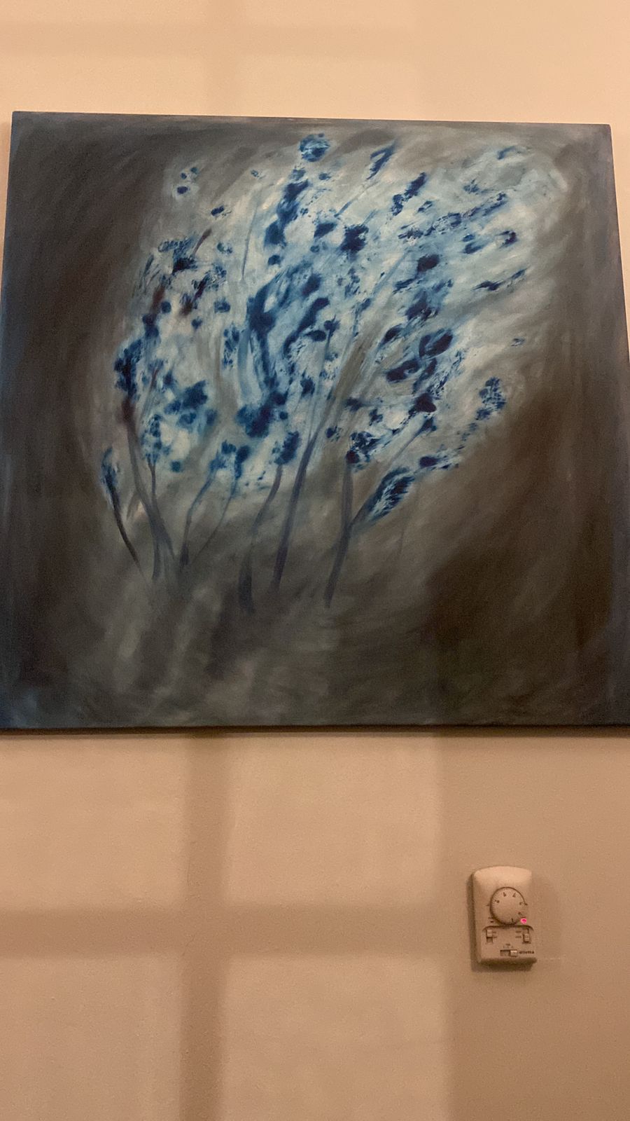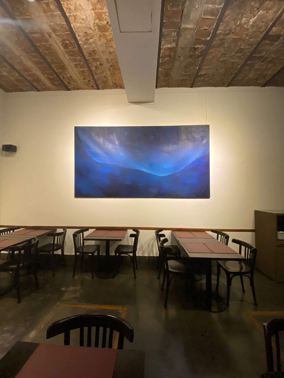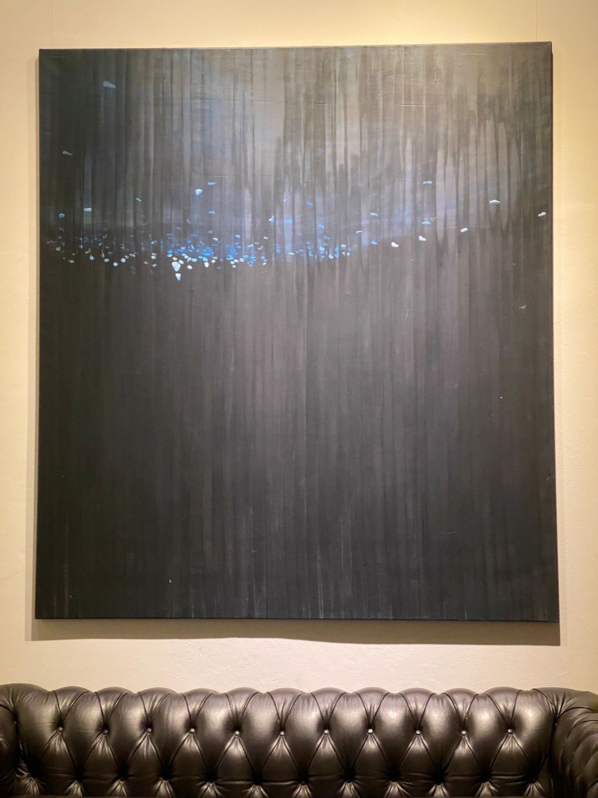 Partículas vuelan y despiertan grises azulados desde la negrura silenciosa de una paleta acotada y fría. Todo parece estar en viaje hacia ningún lado. Transparencias y algún fuera de foco. Todo se cae pero también flota. Algo perturba real o imaginado. Mares, cielos y flora pueblan estas obras sin coordenadas de tiempo ni espacio, operan como metáforas de lo inconcebible. Inmensos, inabarcables nombramos estos territorios sin poder asirlos desde una escala humana. Solo nos quedan la voz y los nombres. El aire y el agua son protagónicos y en su ciclo vital recorren noches estrelladas. Son uno y en la amalgama nos invitan a mirar estas piezas desde la factura oscura allí donde otro Olán se activa y nos redime. Surge una pequeña calma y en la profundidad celeste doló átomos volando.